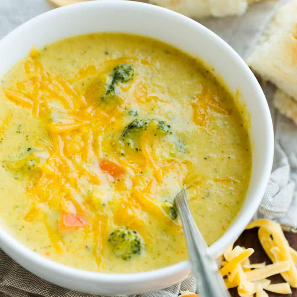 This soup is creamy, loaded with broccoli and a blend of 2 kinds of cheese. It has an amazing flavor.