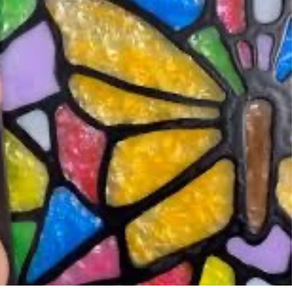 Design and create stained glass using a picture frame, paints, sharpies and glue.